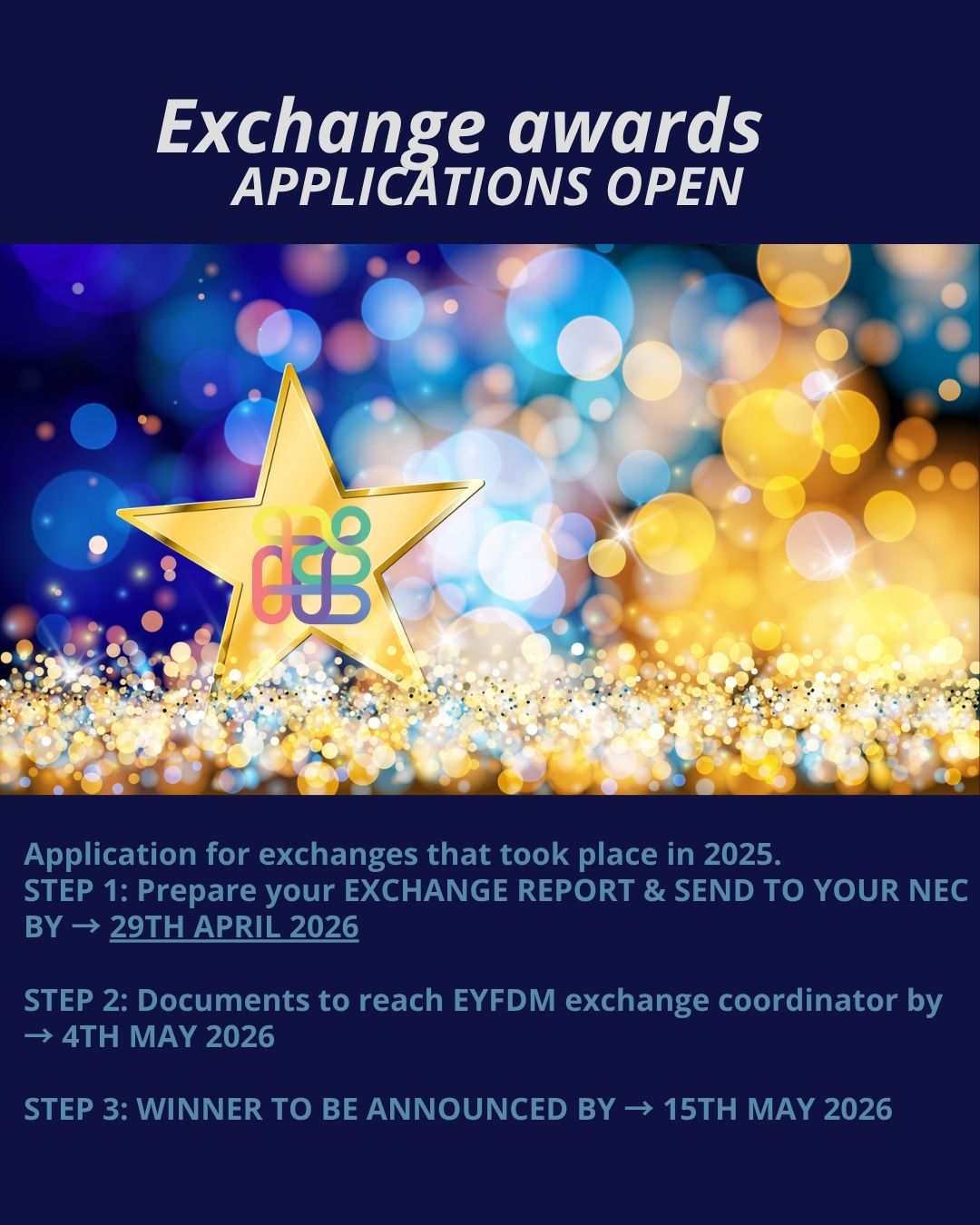 Deadline for submission of candidates to the EYFDM Exchange Officer -> 4th May 2026; Announcement of the winners -> 15th May 2026